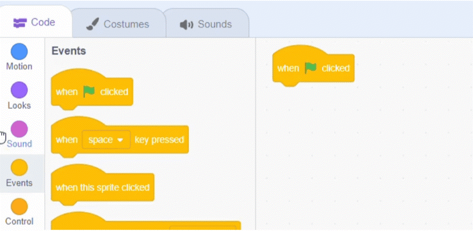 Begin by dragging the "when green flag clicked" block from the Events section into the coding area. Drag the "next costume" block from the Looks section and place it under the green flag block. This block will tell your sprite to switch to the next costume.