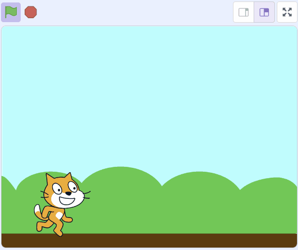Let's start by positioning the cat down at the bottom left so it appears on the ground. Then we will also make it look like it's running by use a loop (forever block) to change it's costume.