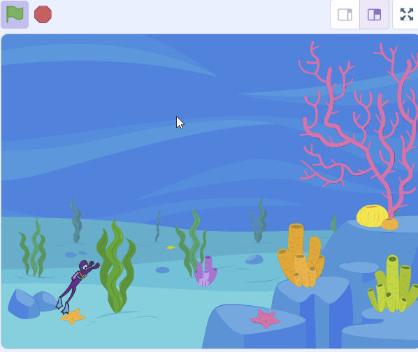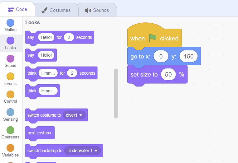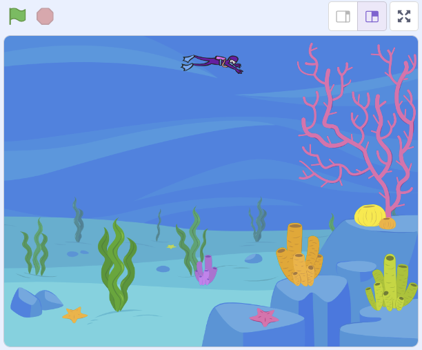 Add the Diver1 sprite from the sprite library. We are going to position the diver at the top middle of the stage area and shrink him to half his size.