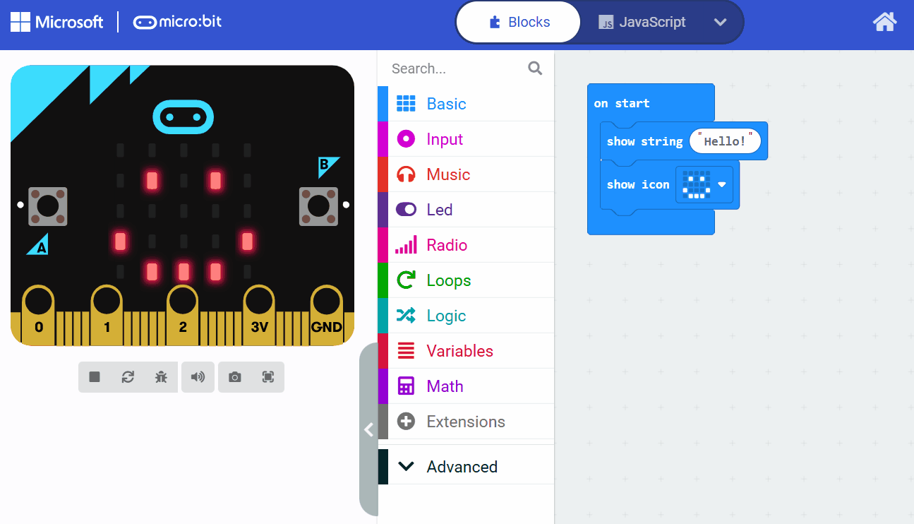 On the left side of the screen, you'll see a simulator of a microbit. When we create some code, we will see it play in the simulator.
