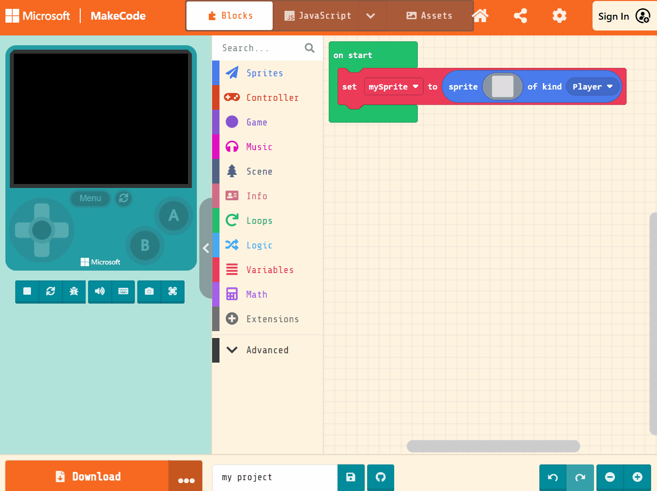 With MakeCode, we can use colourful blocks to build our games, just like Scratch.
