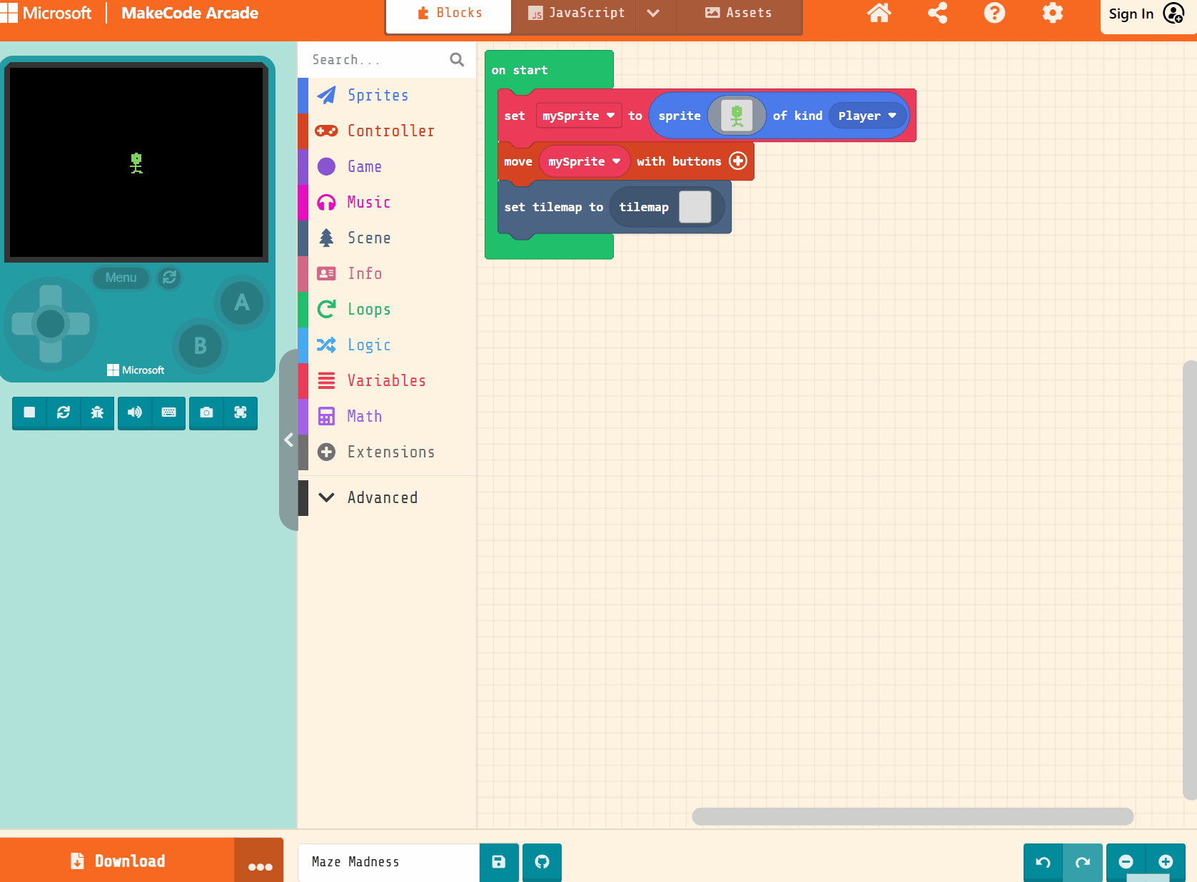 Then click on the grey box in the set tilemap to block, this will open up the tile map editor which you can use to create a simple maze.