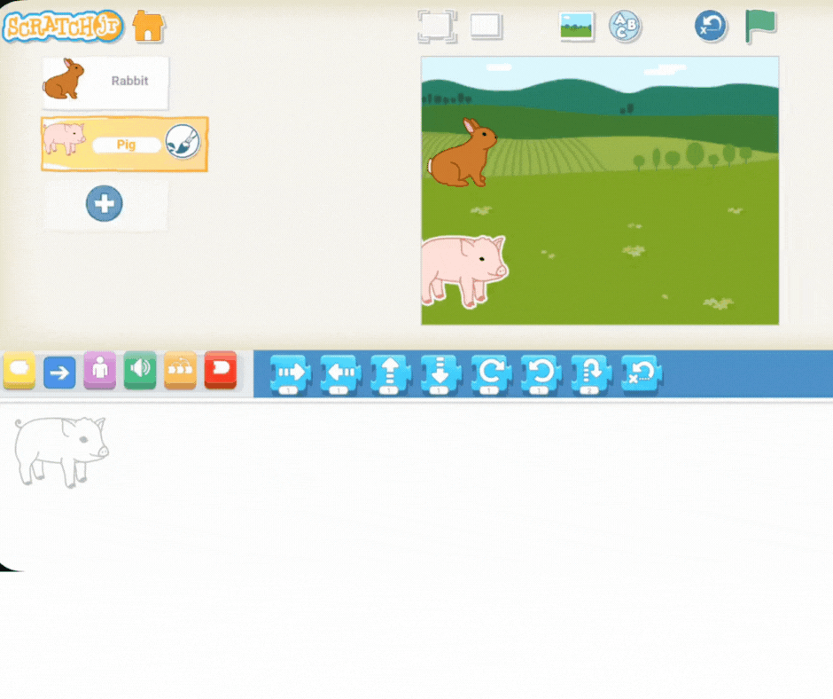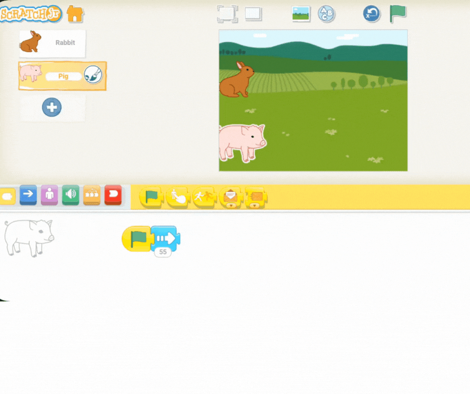 You can make the Rabbit zoom across the screen in a flash or have the Pig take its time and slowly crawl to the finish line. Just drag the speed block into your sequence of commands, and adjust it to make your characters move as fast or as slow as you want.