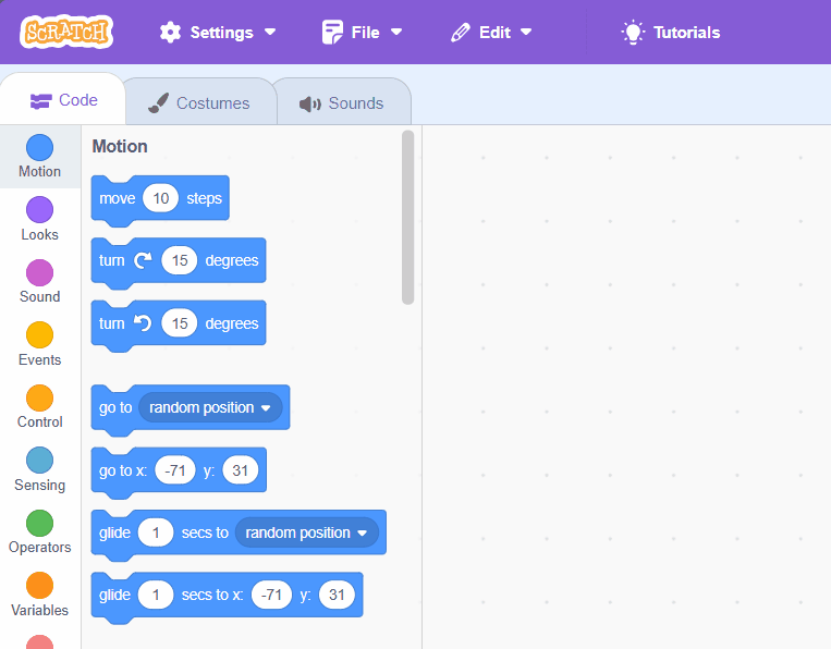 Now let's try making the sprite move. Add the following code blocks to the code area by dragging and dropping them. The colour of the blocks let's you know which "block category" to open.