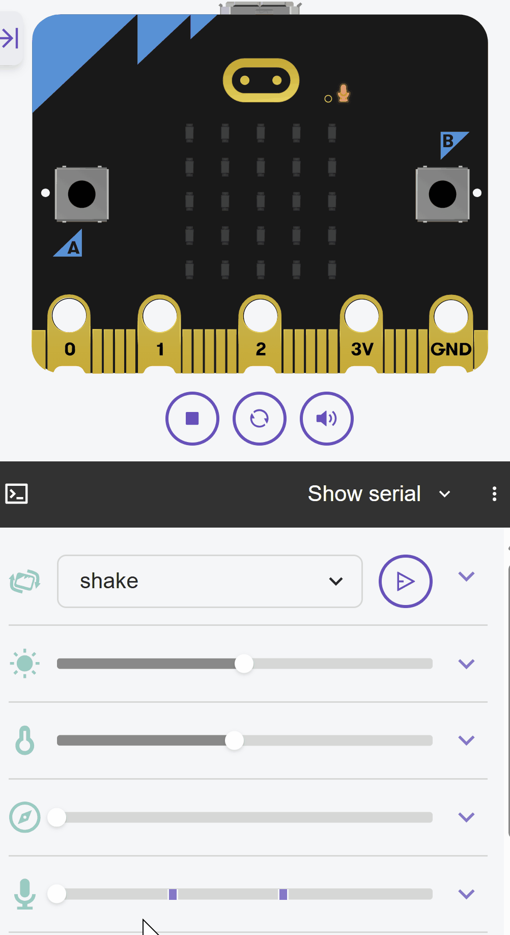 sleep(500)Next, we'll record a short sample when button A is pressed. We'll store 20 sound levels in a list over 2 seconds (sampling every 100ms). This captures a pattern of your voice. After recording, scroll 'Recorded'.