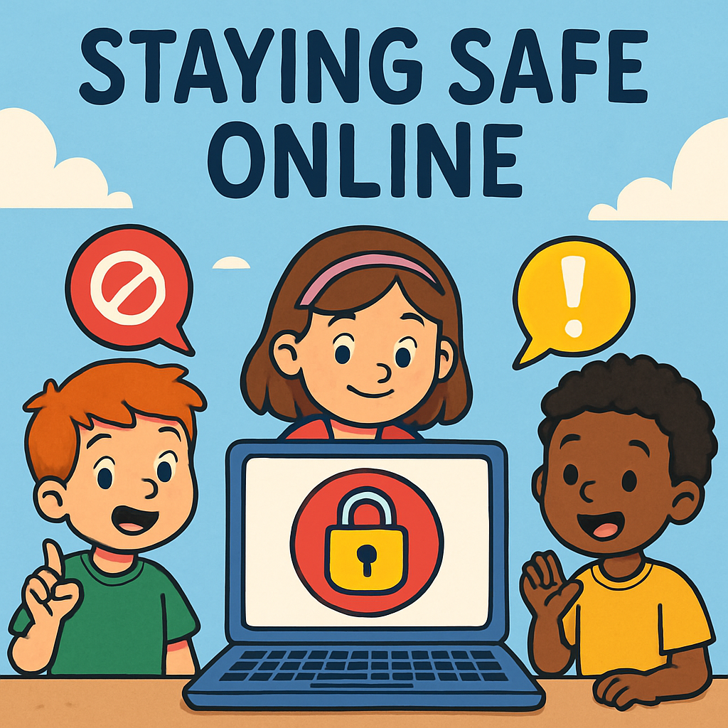 Online safety means being smart and happy when using computers, tablets, or phones β like knowing not to share secrets with strangers or click funny links. It's like road rules for the internet: follow them and have fun without worries!