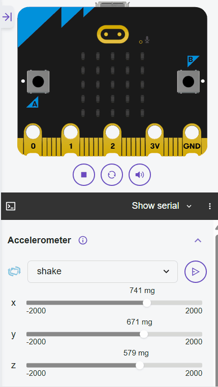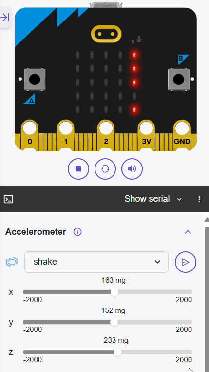 abs() to get positive values and sum them for a simple magnitude proxy. The while True loop makes it continuous.Now, set a threshold (e.g., 2000) to detect a swing. Use an if statement inside the loop to check if the magnitude exceeds the threshold, and if so, show an image like a happy face to indicate detection.