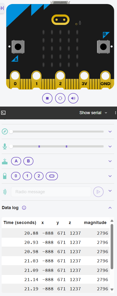 To log the data during a detected swing, we'll use the log module. First, set up the logging labels outside the loop. When a swing is detected, clear any previous log, then take 10 quick readings (every 50ms) and log the x, y, z, and magnitude if still above threshold. After logging, scroll "Logged".