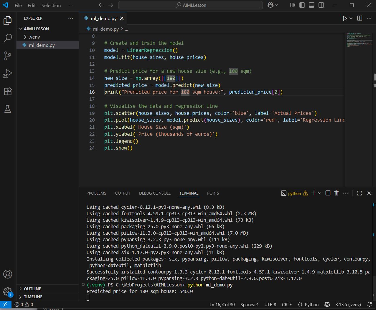 Create a file named ml_demo.py inside your AIMLLesson folder, and add the following complete code to it: