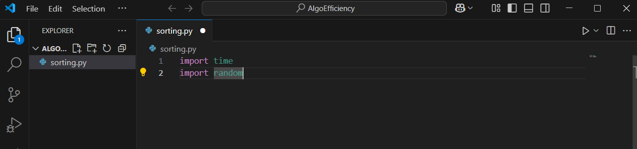 Open VS Code and create a new folder called 'AlgoEfficiency'. Inside it, create a file named 'sorting.py'.
