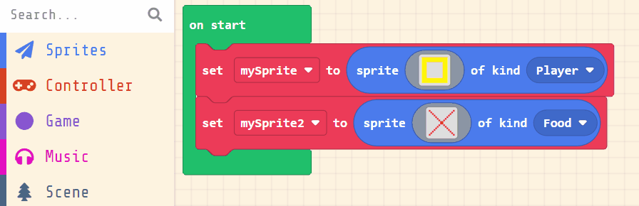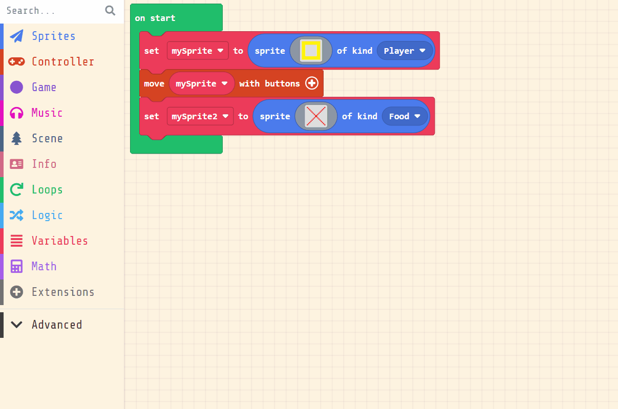 set position block.pick random blocks put in the values 0 to 160 for X and 0 to 120 for Y. The screen is 160 in width and 120 in height so these values ensure that the food sprites can appear anywhere on the screen, from the very top to the very bottom, and from the far left to the far right.
