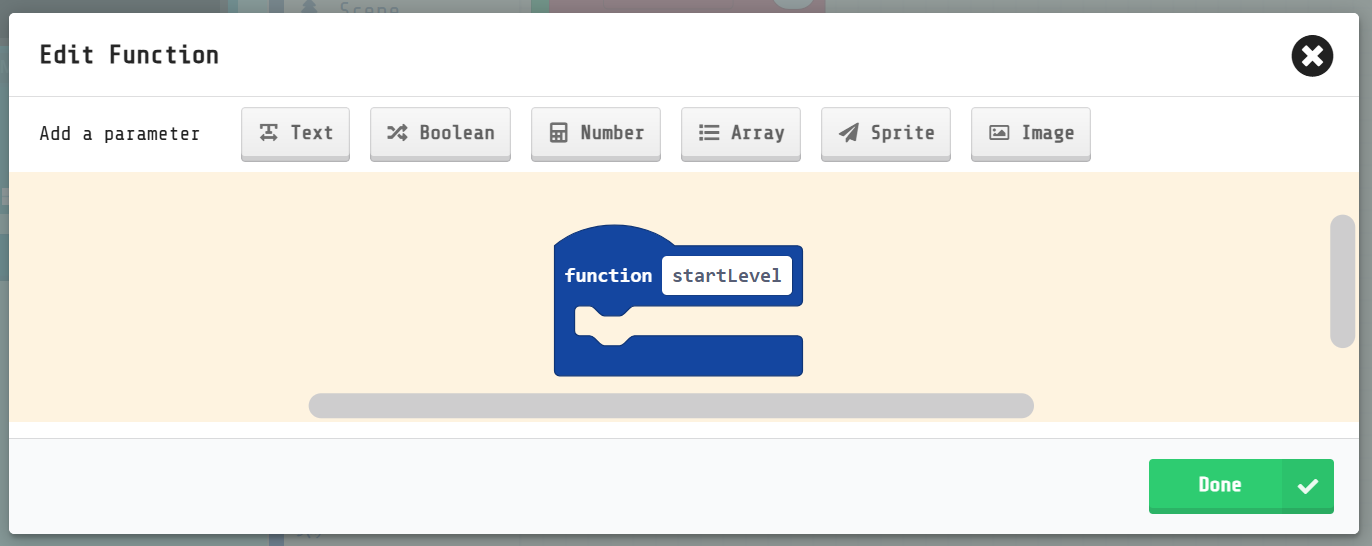 Give your function a name that makes sense and choose whether to pass anything into the function. In this example we will pass in a sprite and some text for it to say.