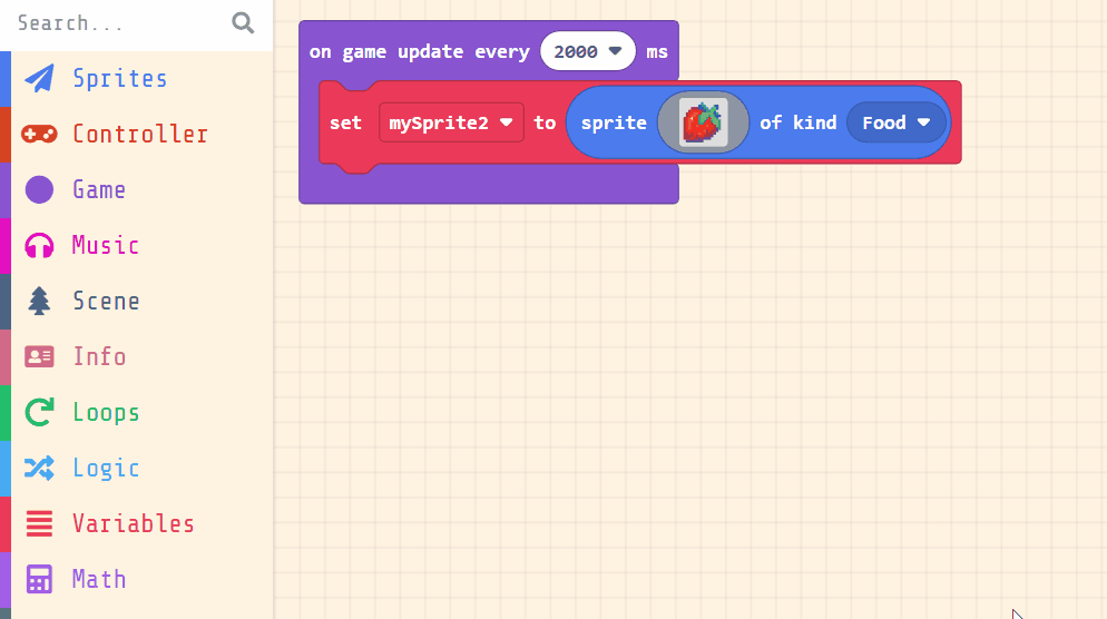 set block.move blockNext let's create some fruit that we need to collect. Every 2 seconds a new strawberry will be created somewhere along the top of the screen (we will program it to fall in the next step).