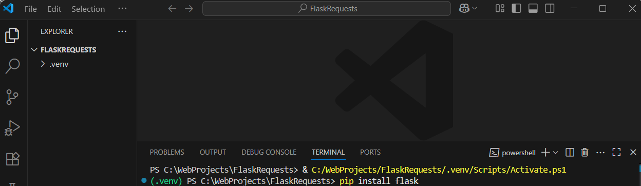 FlaskRequests'. You can place it in your Documents folder or any preferred location.File > Open Folder, then select the 'FlaskRequests' folder.With your project folder ready, you're set to create a terminal in the next step.