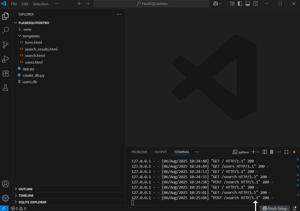 Continue working in your 'FlaskSQLiteIntro' project folder from the previous lesson.