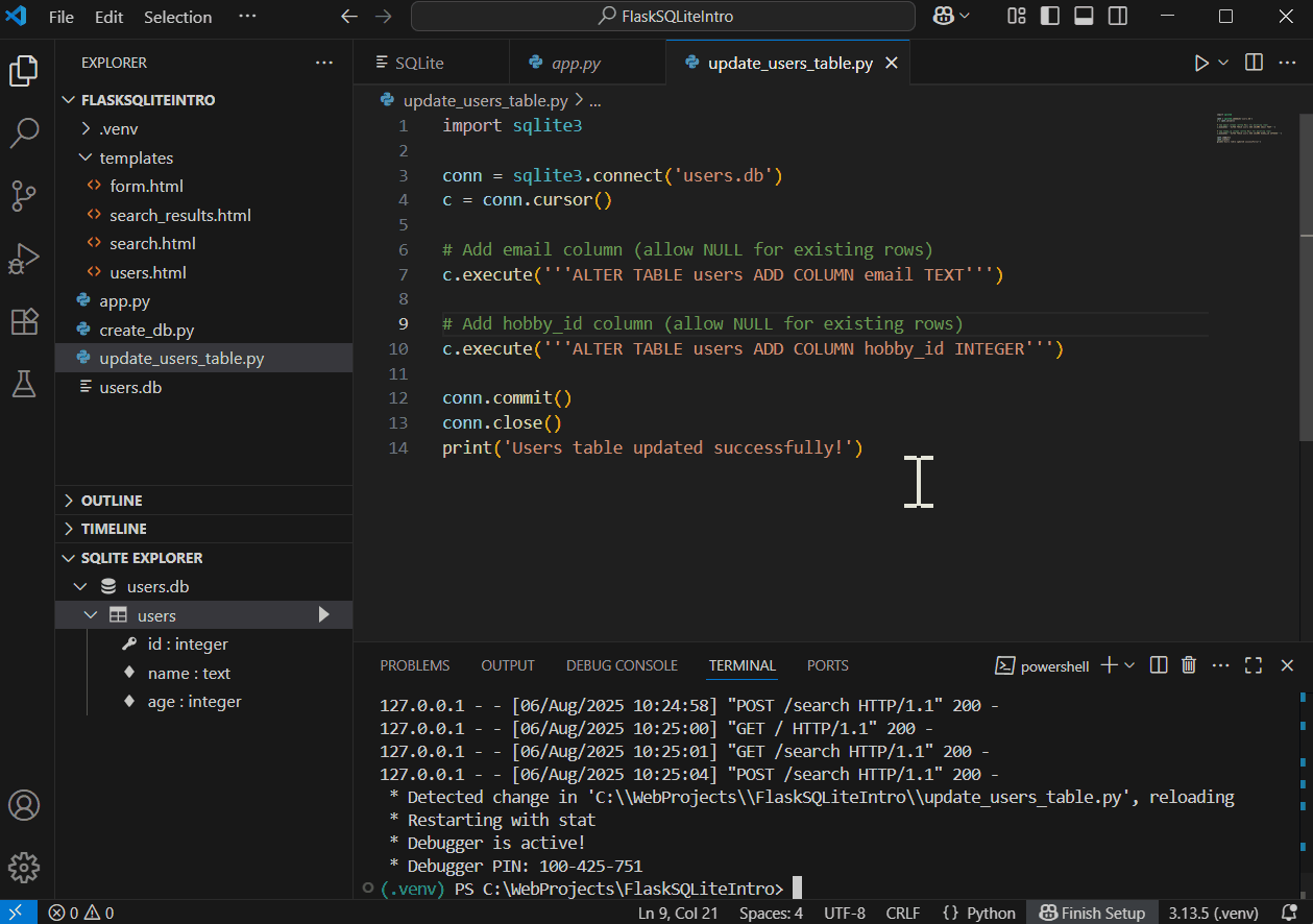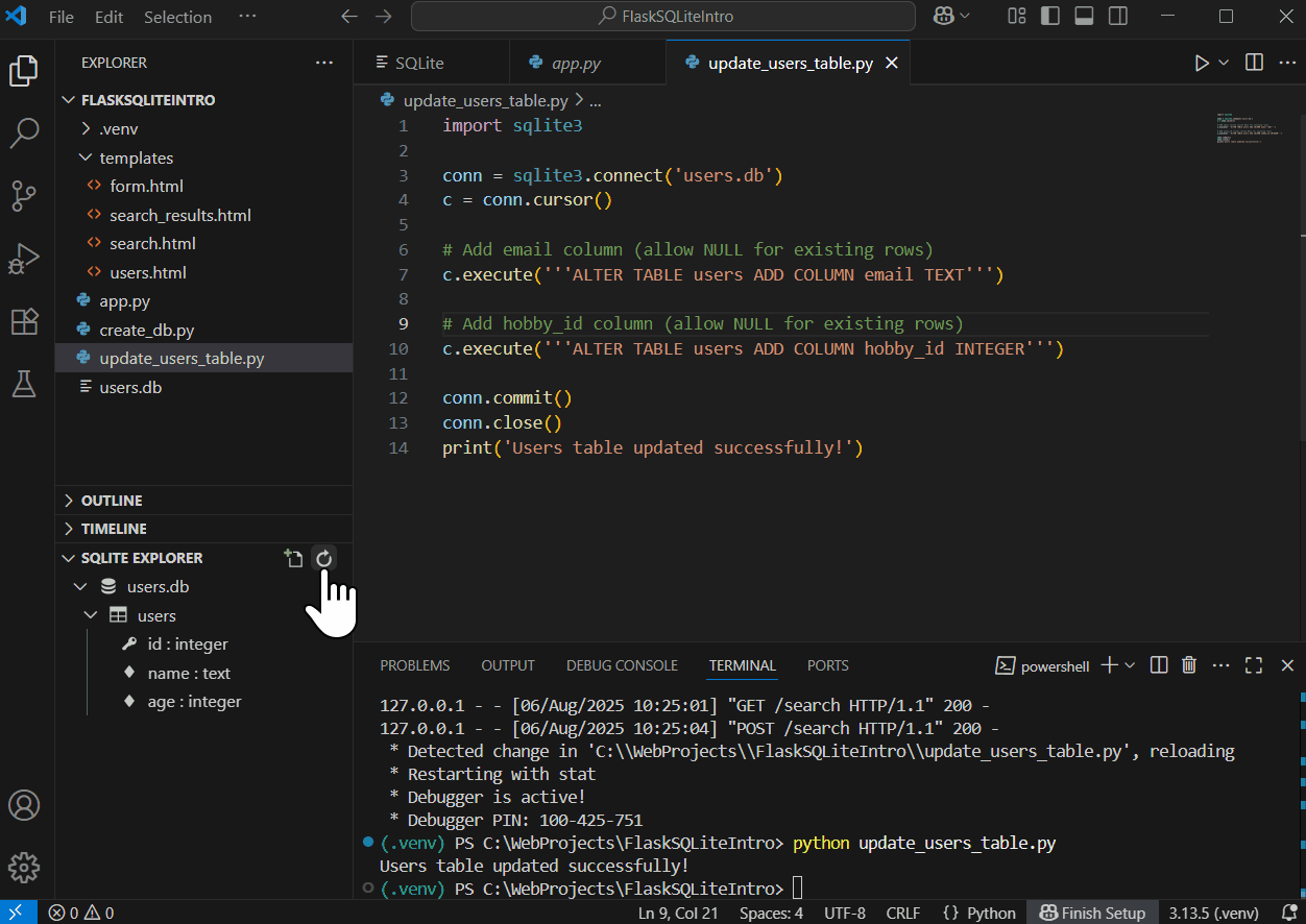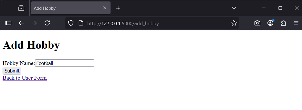 In the terminal, run python app.py. Then visit http://127.0.0.1:5000/add_hobby, add a hobby, and check it in the SQLite extension.