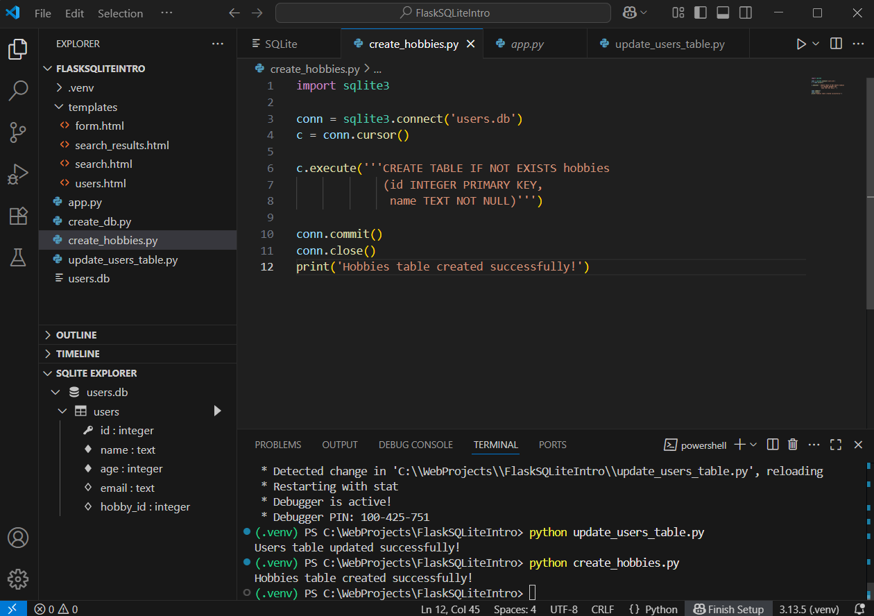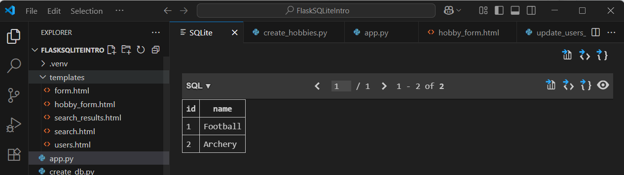 Run python create_hobbies.py. Check the new table using the SQLite extension.