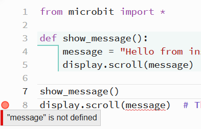 message variable outside of the show_message() function.To create a new Python project for a Microbit, open the website python.microbit.org.