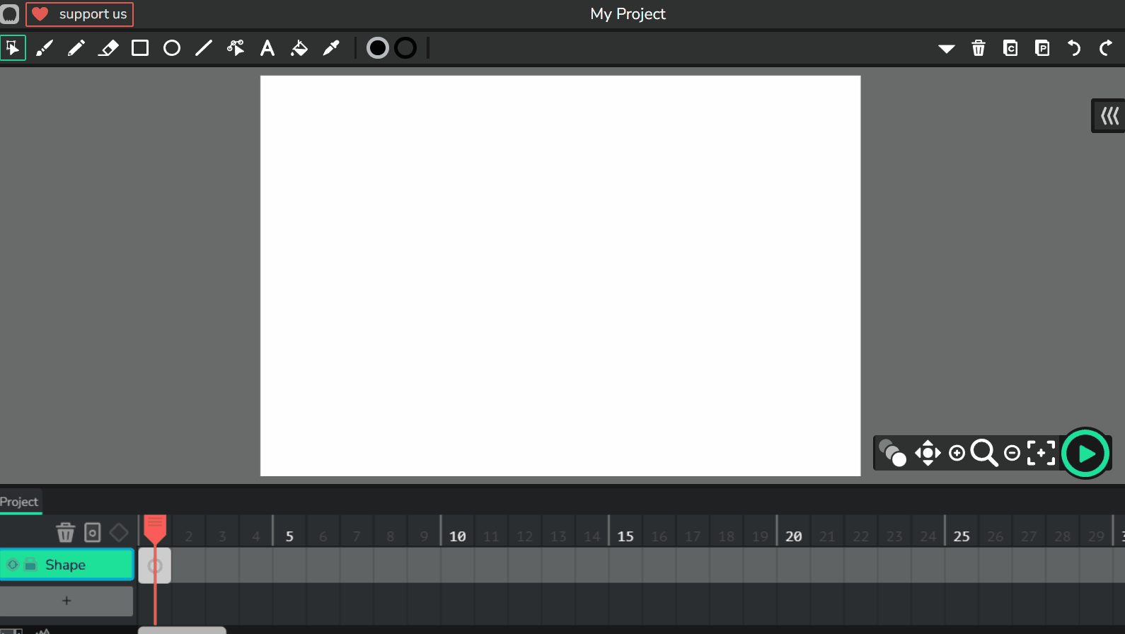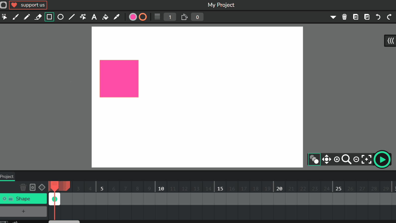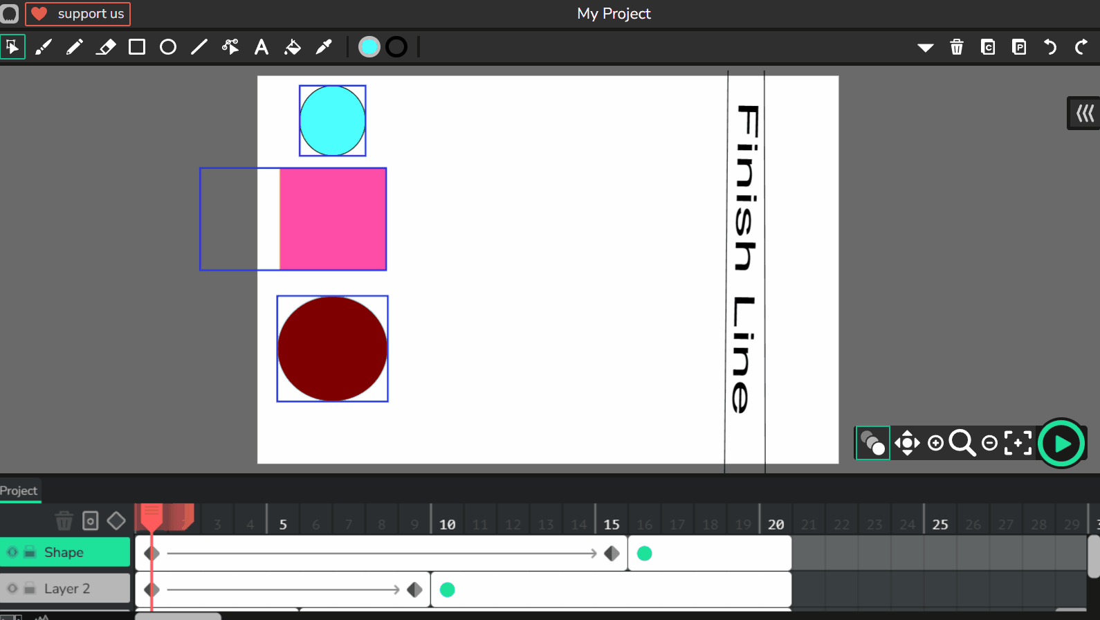 Now that you’ve created a sliding animation by adding frames manually, let’s make it even smoother using a feature called tweening. In Wick Editor, tweening helps your shape slide smoothly from one spot to another by calculating the positions in between keyframes.