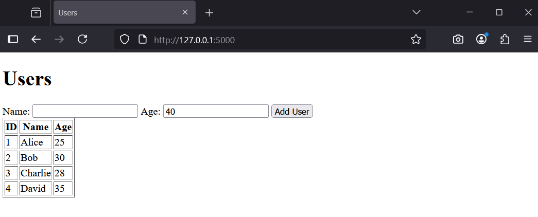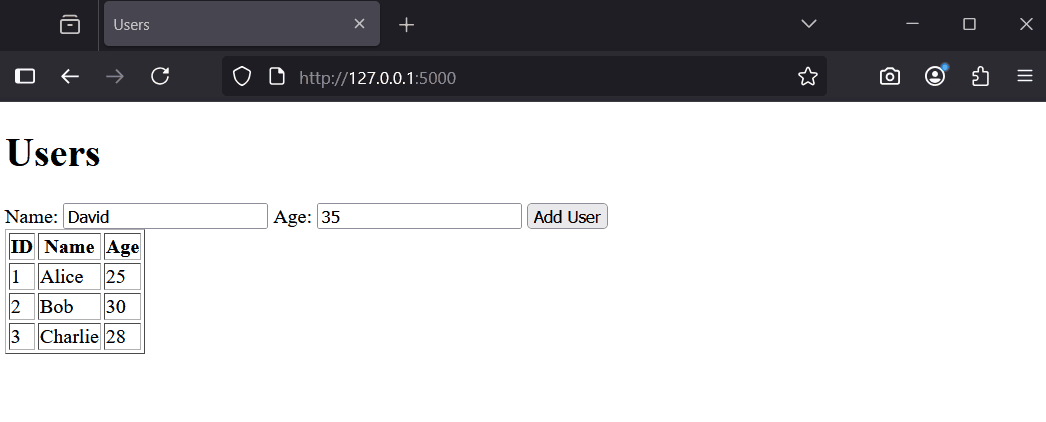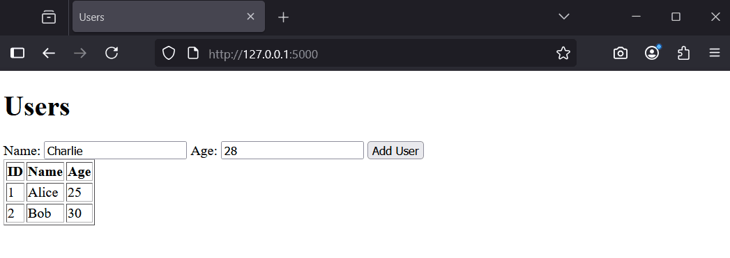 Try adding a user, like 'Charlie' with age 28. Refresh to see the updated list.