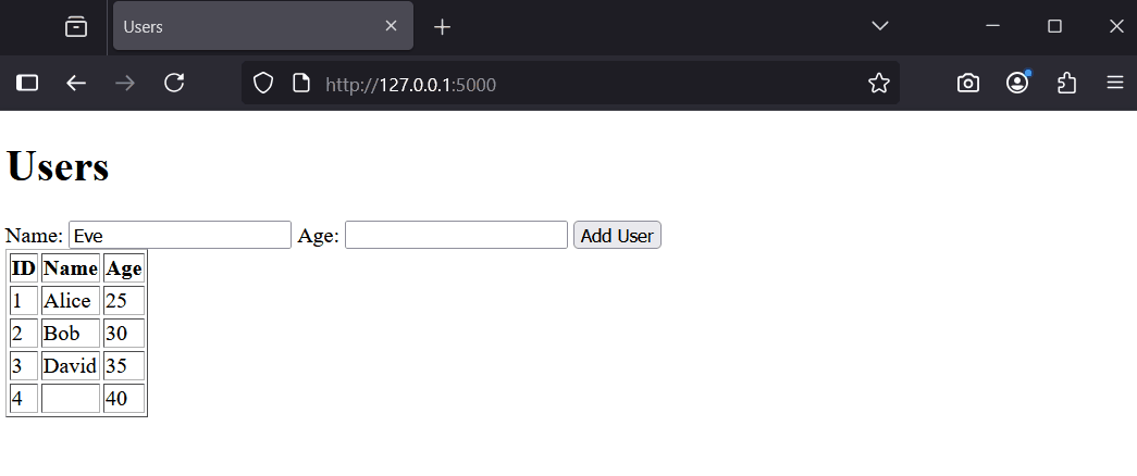 Now, create a basic Flask app with a form to add users and display them. This will be the base for testing and validation.