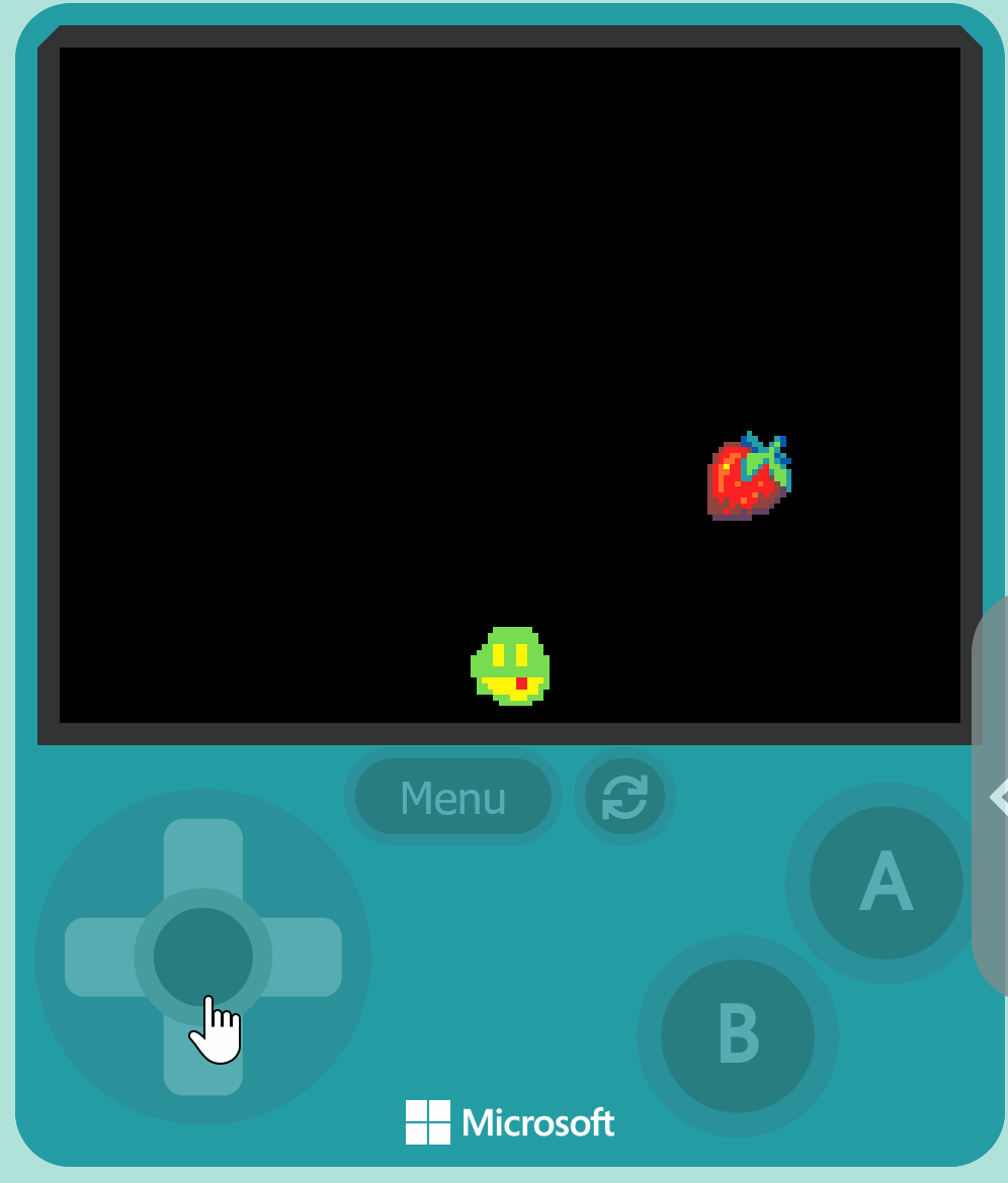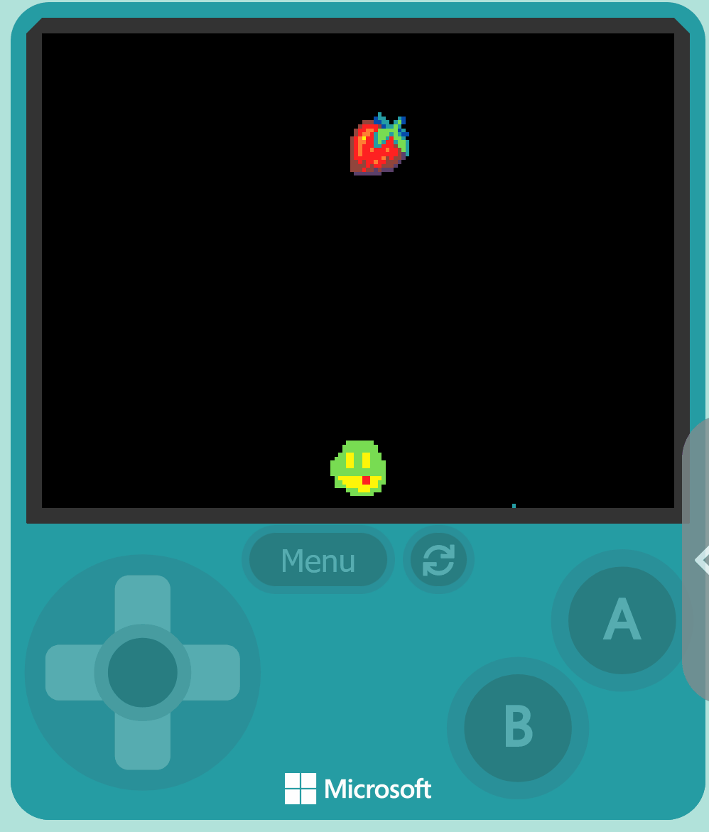 In this step, you will create fruits that fall from the top of the screen. These fruits are what your character will collect. You will use different functions in MakeCode Arcade to do this.