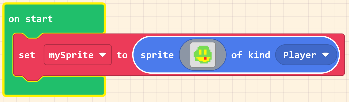 Let's create the player character. We'll use the 'set mySprite to sprite of kind Player' block to create a sprite for the player character.